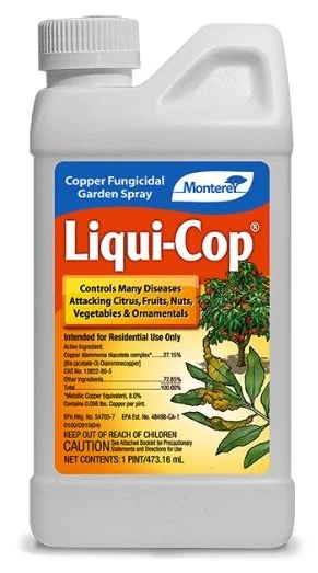 There are 2 primary sprays that can be used for controlling the spores of many diseases or funguses through dormant spraying; Monterey’s Liqui-Cop or Fertilome’s Copper Fungicide. Both of these products offer very similar results and control the spores but each have thier advantages.